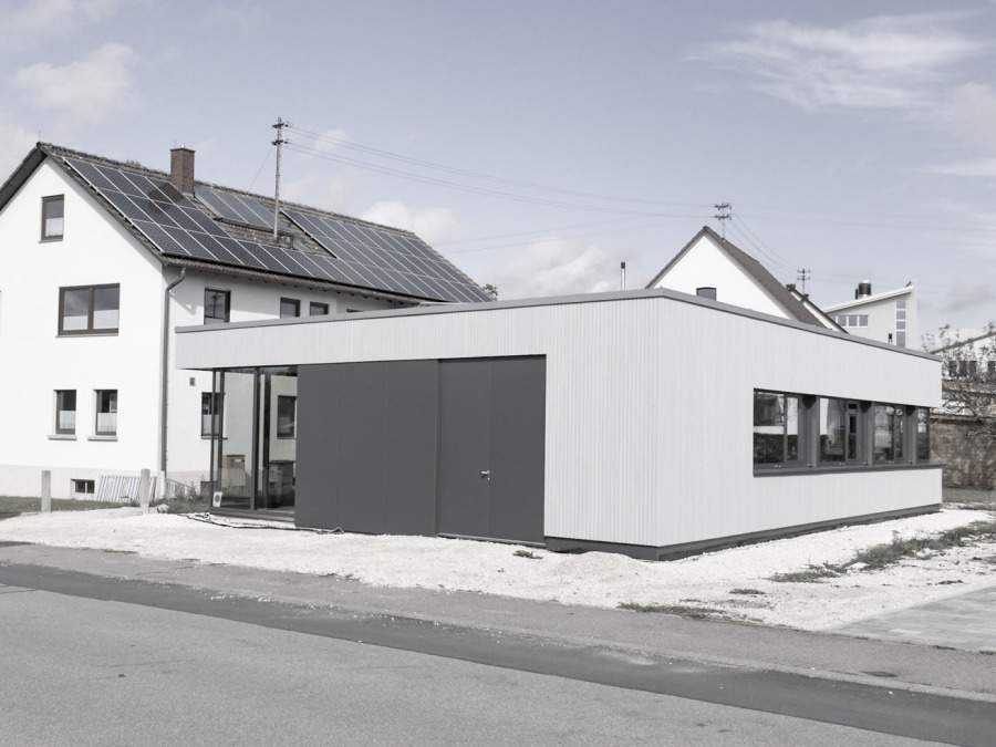 Die Firma Hipp hat einen größeren Platzbedarf für die Fertigung. Ein Flachdachbaukörper wurde dem Satteldachhaus angefügt. Durch die abgerückte Platzierung des Neubaus erhält die Firma ein neues Gesicht nach außen. Es entsteht ein Lichthof zwischen Alt und Neu und die neue Eingangssituation erhält nun eine klare Zuordnung zur Firma. Das städtebauliche Ziel „sorgfältiger Umgang mit bestehender Bausubstanz“ wird erreicht. Das Bestandsgebäude entlang der Straße wird weiterhin als Solitär wahrgenommen. Die Ausführung wird in Holz-Ständer-Rahmen-Bauweise umgesetzt und wird mit einer vorvergrauten Holzschalung verkleidet.