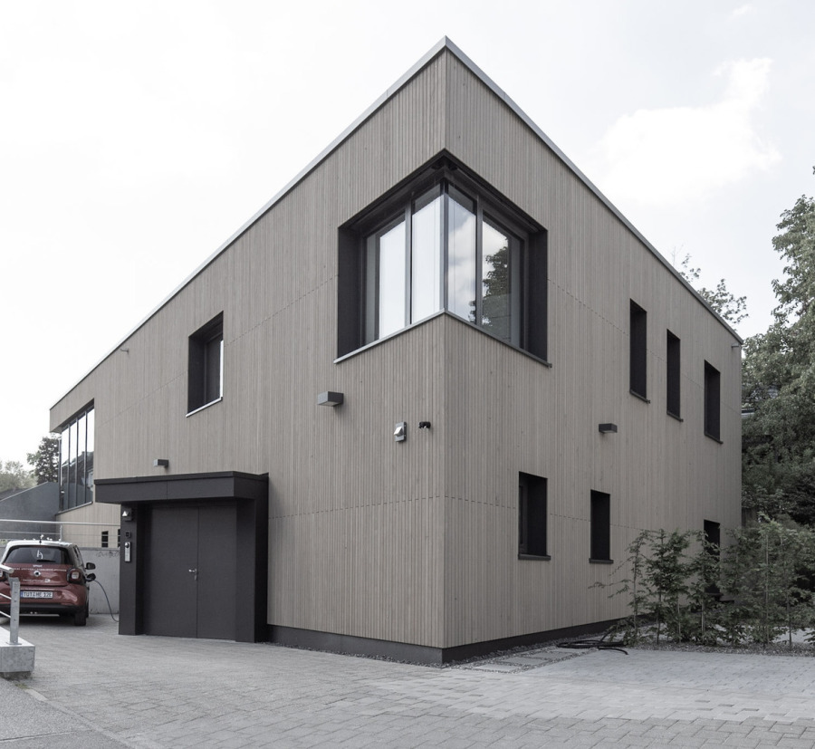 bestehende Balkonbereich wird mit einer Verglasung geschlossen. Der Anbau umschließt nun zweiseitig das Wohngebäude. Die Nutzungseinheiten von Wohnen und Arbeiten sind klar an der Gebäudestruktur