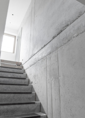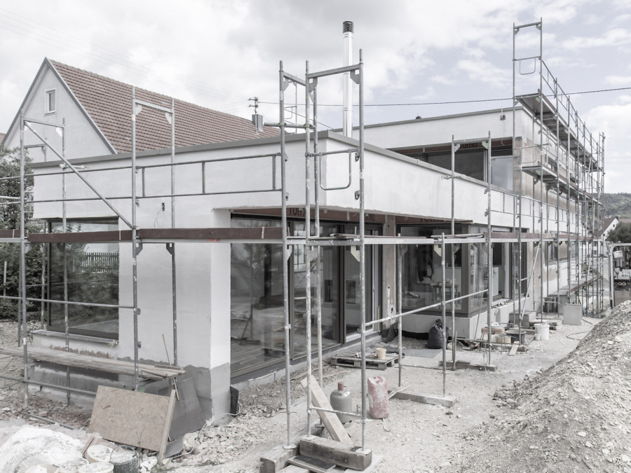 Das bestehende Wohnhaus war Aufgrund der Größe und niederen Geschosshöhen für den Bauherr nicht erhaltenswert. Der Wunsch war hier ein Neubau im alten Ortskern. Die Grundidee "Der Baukörper schwebt über der Mauer“ im Untergeschoss, hinter der sich die Garage befindet." Die Garage tritt zurück und ist nicht sofort ersichtlich. Der Baukörper wird als Monolith in das Grundstück eingefügt. Der neue Baukörper passt sich im Norden an den Grenzverlauf an. Richtung Osten nimmt er die Gebäudefluchten der bestehenden Nachbargebäude auf. Nach Süden öffnet sich das Wohnhaus zum Garten. Durch den Höhenunterschied wird das Wohnen von Essen und Kochen getrennt. Dies erfolgt über drei Stufen und einem Kaminofen als Raumteiler. Das Eckfenster im Wohnzimmer öffnet den Blick in den Garten und auf die Kirche. Der abgetrennte Schlafbereich gibt den Blick frei in die Rathausstraße. Der Kinderbereich befindet sich im Obergeschoss. Das Gebäude wurde in Massivbauweise umgesetzt. Warme Materialien wie Holzfenster und ein Parkettboden in Eiche, ein atmungsaktiver Rotkalkputz geben ein angenehmes Raumklima. Betonwände bleiben unverputzt und harmonieren zusammen mit dem Eichenholz.