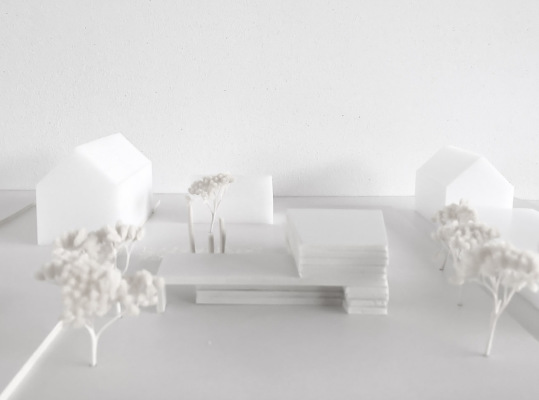 Die Grundidee "Die Stellung des neuen Baukörpers bildet mit dem Bestandsbau der alten Schmide einen Innenhof". Die alte Schmide ist ein Ensemble von 2 Gebäuden, die erhalten bleiben und das Baufeld in nördlicher Richtung begrenzen. Das Grundstück ist sehr weitläufig und schließt gartenseitig mit einem unverbaubaren Naturschutzgebiet ab. Auf der Nordseite grenzt das Grundstück an ein Firmengebäude. Das neue Gebäude bildet eine L-Form im EG und öffnet sich zum neu definierten Innenhof in Richtung alte Schmiede und zum weitläufigen Garten. Das Durchwohnen von Innen nach Aussen wird ermöglicht. Zum bestehenden Fabrikgebäude wird Abstand genommen, der sich in Richtung Garten immer mehr weitet und öffnet. Es entstehen 2 Baukörper. Ein liegender Baukörper im EG auf dem das OG ruht und zurückspringt und nach Westen eine Dachterrasse bildet. Die abgestufte Form vom Baukörper setzt neue Grenzen und es entstehen Innenräume mit verschiedenen Blickachsen und grünen Aussenräumen. Das neue Wohnhaus löst sich weit ab vom Bestand und der Garten kann geschützt genutzt werden. Der überdachte Aussenraum Richung Süden ist ebenfalls geschützt und gibt den Blick frei in die Natur.